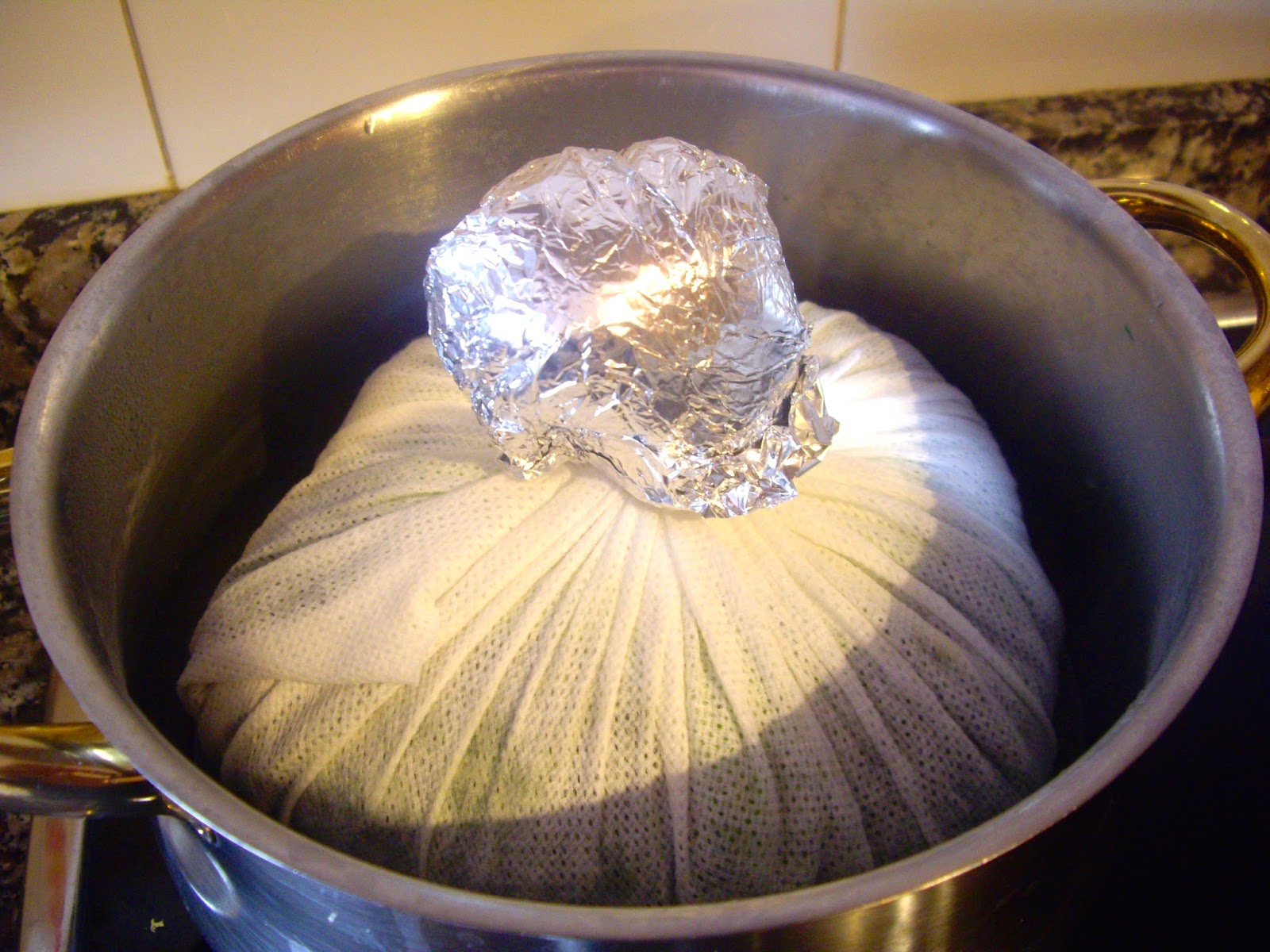 5º Coloco el repollo relleno sobre un paño, o bien una gasa de cocina y lo cierro bien y lo ato, para que mantenga la forma durante su cocción.